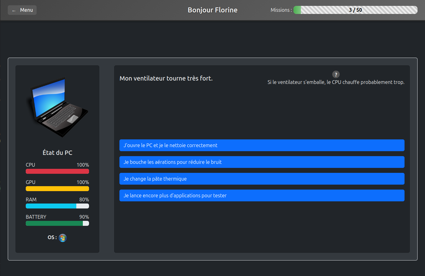 Nous avons choisis de partir sur un jeu de gestion de la vie d’un ordinateur : savoir faire les bons choix pour préserver notre matériel. L’ordinateur possède 4 caractéristiques (CPU, GPU, RAM, et la batterie), et en fonction des actions de l’utilisateur, l’état de ces composants peut évoluer. Lorsque l’on arrive au bout des 50 décisions à prendre, si notre PC est encore en vie, on décide enfin de passer sur Linux.